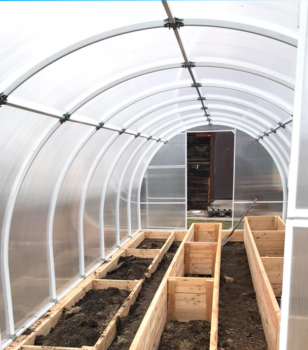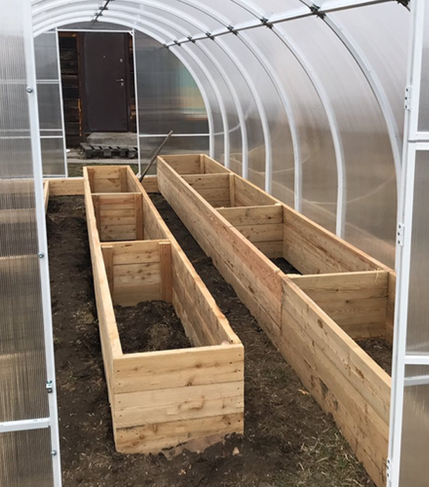 Грядки из лиственничной доски в каркасной теплице