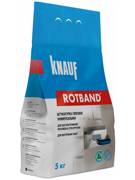 Ротбанд - это гипсовая сухая штукатурка от компании Кнауф. Основой штукатурки является гипс высшей категории, который разбавлен смесью минеральных наполнителей, играющий роль связующего вещества. Применяется, в основном, для выравнивания бетонных, кирпичных и цементных поверхностей. Но также она с успехом может применяться и для гипсокартонных перегородок. Данный вид штукатурки используется только для внутренних работ.