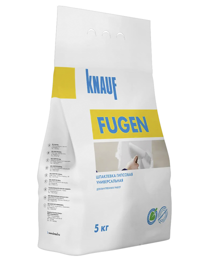 Шпаклёвка Фуген (прежнее название – Фугенфюллер) предназначена для проведения внутренних работ. Ее главная составляющая – гипс, плюс фирменные добавки для замедления схватывания и повышения пластичности смеси. Технические характеристики позволяют применять состав при замазке швов после крепления гипсокартона, неровностей и трещин на поверхностях стен.