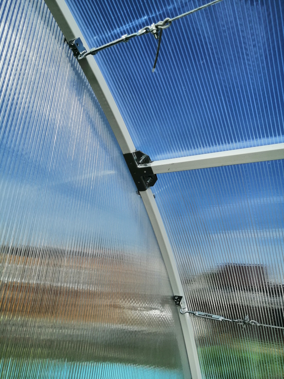 Сборка каркаса осуществляется с помощью болтовых оцинкованных зажимов и крепежа, входящих в комплект поставки. В крепежный комплект также включены саморезы и шайбы для монтажа покрытия из сотового поликарбоната, фурнитура для открывания и фиксации дверей и форточек теплицы.