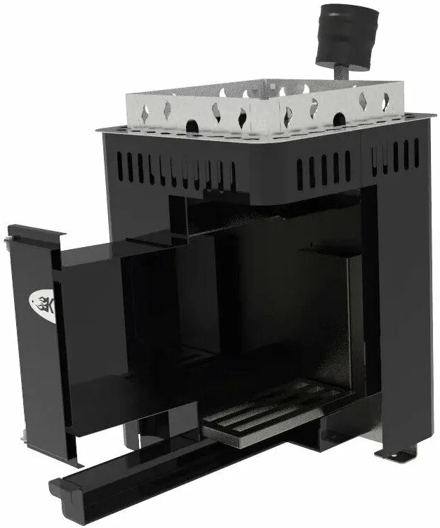 Банная дровяная печь с открытой каменкой, рассчитана на объем парной до 10м3. Печь имеет удлиненный топливный канал, что позволяет устанавливать печь в парильном помещении, а закладка дров производится из смежного помещения.