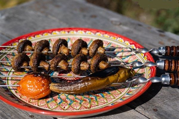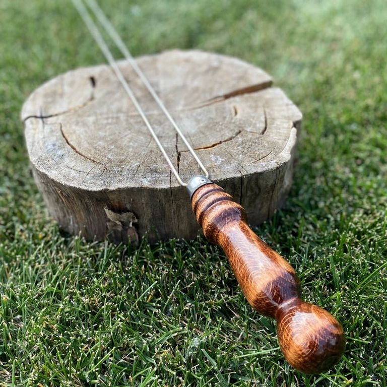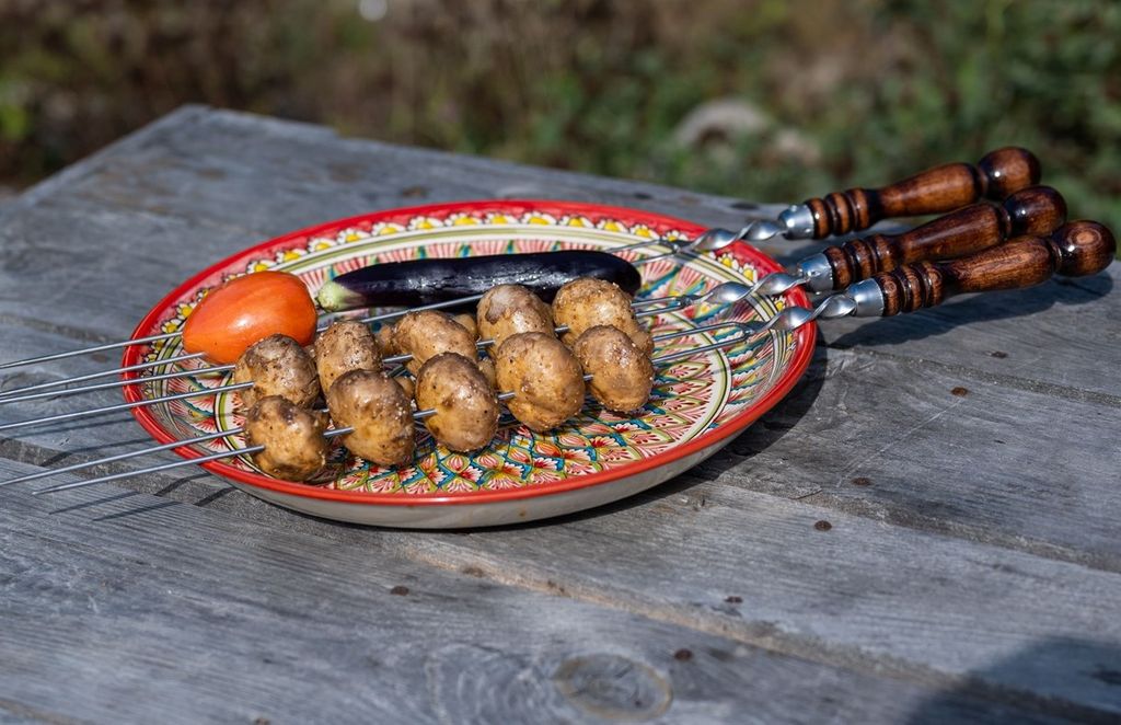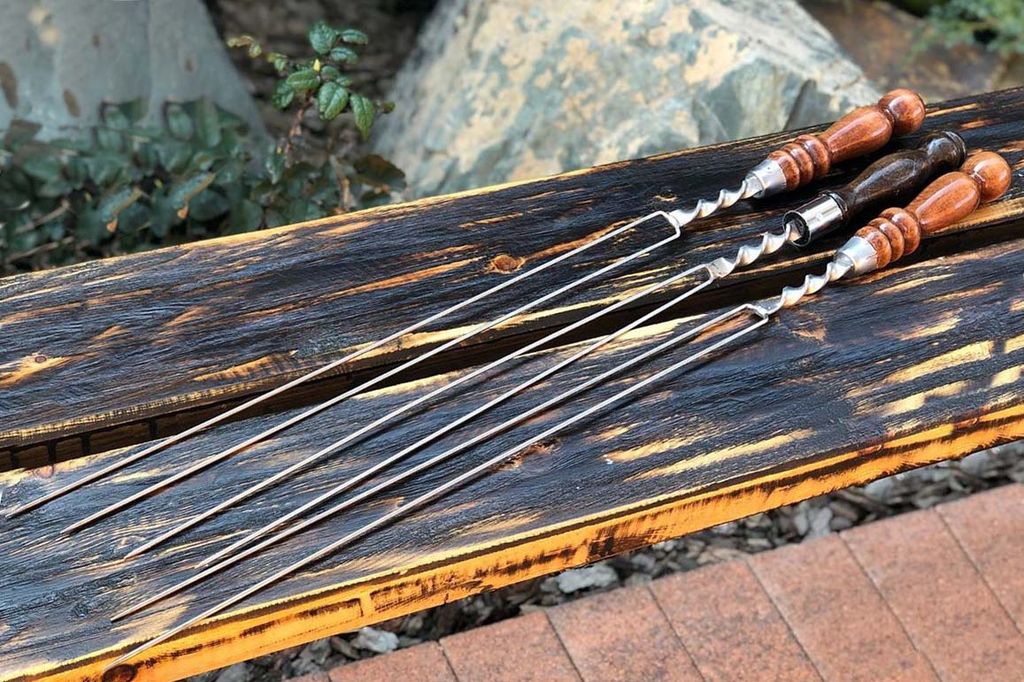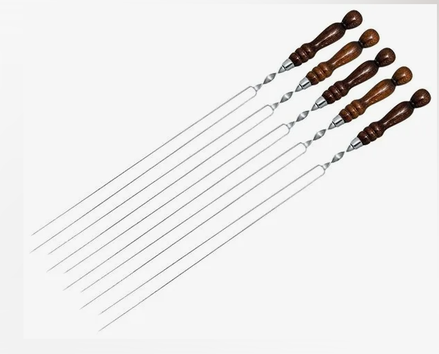 Практичные шампуры в виде двух спиц для грибов и овощей - из нержавеющей стали AISI 430 и деревянной ручкой из бука, покрытой несколькими слоями лака. Огнеупорное кольцо обжато в основании ручки и зашплинтовано для того, чтобы ручка надежно фиксировалась к лезвию шампура и в дальнейшей эксплуатации не разбалтывалось и не вылетало.