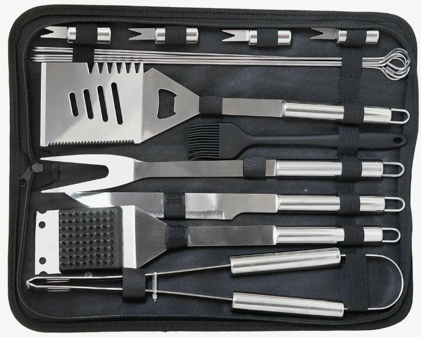Набор для барбекю из 15 предметов, упакованный в удобный и стильный кейс, станет прекрасным дополнением к пивным наборам, рыболовным снастям и туристическим принадлежностям. В нашем подарочном наборе для мужчин вы найдете универсальный нож, щетку для чистки, шампуры 6 штук, вилку, лопатку, 4 мини-вилки для овощей, а также, длинные щипцы для барбекю, которые обеспечат Вам комфорт и безопасность при готовке на мангале. Качественный металл и удобные ручки аксессуаров позволят уверенно обращаться с продуктами на огне, не опасаясь ожогов. Универсальный походный набор подойдет для приготовления стейков, шашлыка, овощей и грибов на решетке мангала. Наш набор является идеальным подарком на День рождения, 23 февраля, Новый год или любой другой праздник. Благодаря компактной подарочной упаковке в виде сумочки, вы можете легко хранить его в шкафу или багажнике автомобиля. Наборы для мужчин подходят для использования дома, на даче, в саду, на газовых или угольных грилях. Новогодний подарочный набор кухонного инвентаря ПРЕМИУМ КЛАССА из 15 предметов обязательно удивят ваших любимых мужчин. Мужской подарочный набор посуды для решетки гриль, на мангал, барбекю содержат все самое необходимое, и станут полезным аксессуаром для отдыха на природе, загородного пикника, охоты и рыбалки