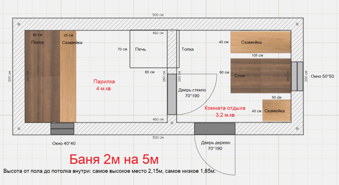Баня 2м*5м, крыша 1 скат, топка внутри, баня со стационарной мебелью