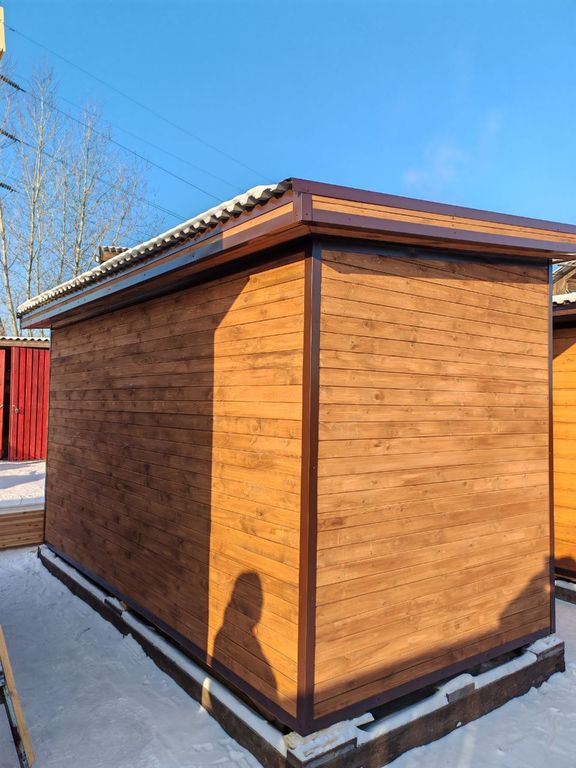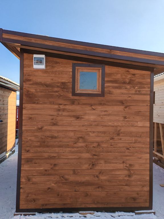 Фасад: Вагонка сосновая; металлические углы; два окна из липы.
