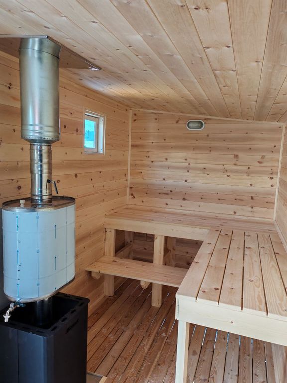 Отделка внутренняя: стены -вагонка кедровая; проливные полы - планкен (доска лиственничная) ; полки банные кедровые; уголки; наличники.